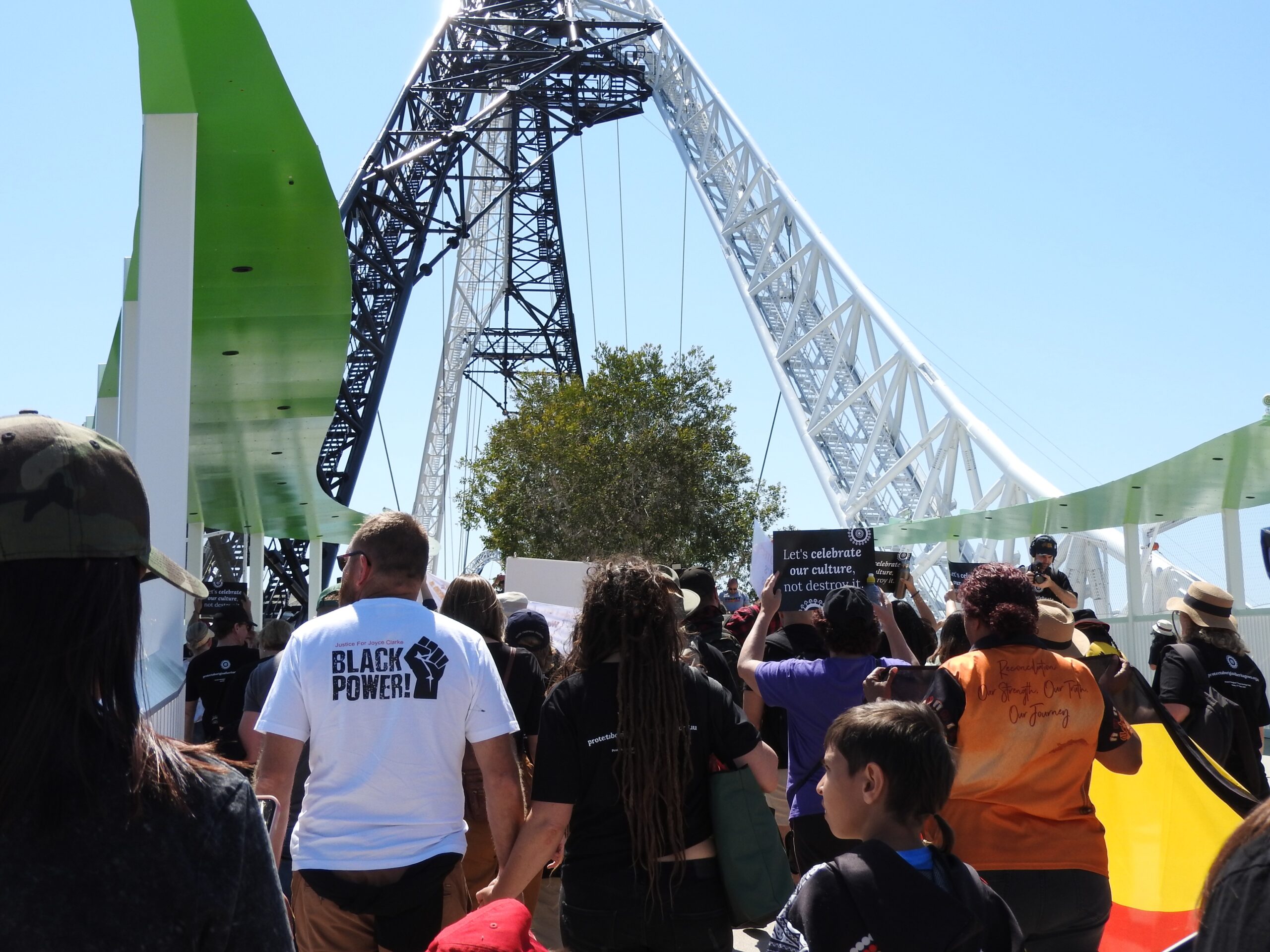 People from across the state travelled to Perth to take part. Proceedings commenced with a Welcome to Country conducted by Noongar Elder Mr John McGuire, which was followed by a response from Martu Elder Mr Bruce Thomas. Walkers then proceeded to the Derbal Yerrigan (Swan River) foreshore and across the Matagarup Bridge. Accompanied by traditional singing from Mr Thomas as they made their way, their message was chanted loud and clear: “No Veto, No Bill”.